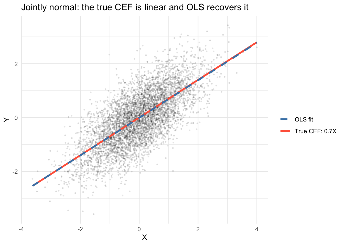 The BLP equals the CEF when the CEF is actually linear. An important sufficient condition: if \((X, Y)\) are jointly normal, the CEF is linear. Let’s verify.