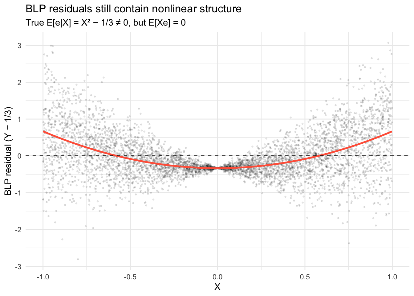 The BLP residual \(e = Y - \alpha - \beta X\) satisfies \(\mathbb{E}[Xe] = 0\) (uncorrelated with \(X\)), but not \(\mathbb{E}[e|X] = 0\). The residual still contains nonlinear structure: the conditional mean of the residual traces out \(X^2 - 1/3\) rather than zero: