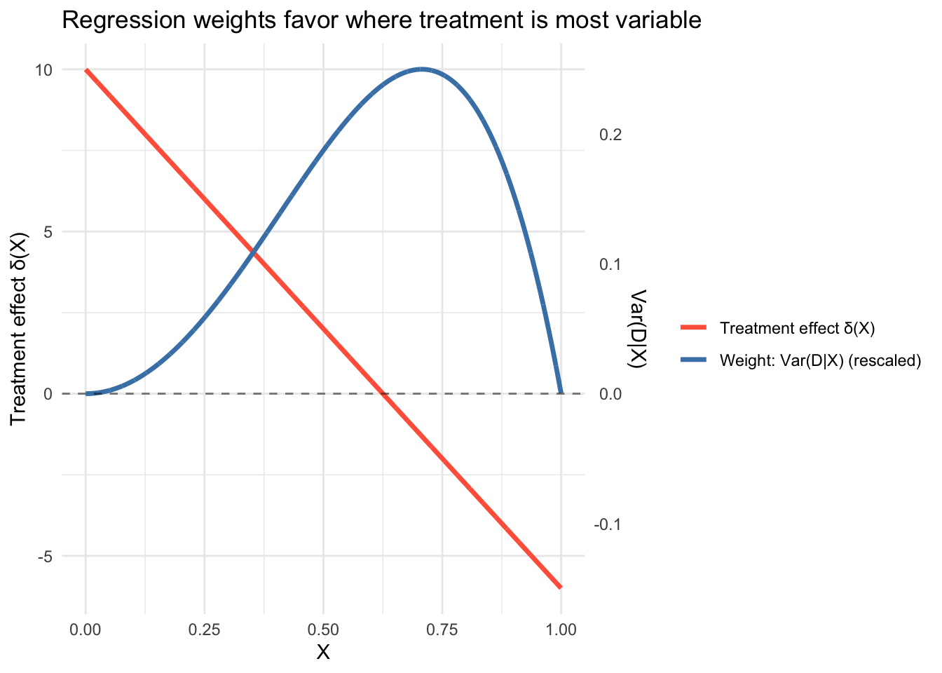 The unweighted average treatment effect is about 2, but the regression coefficient is near 0. That’s because treatment assignment \(p(X) = X^2\) is most variable around \(X \approx 0.7\) (where \(p(1-p)\) peaks), and at that point the treatment effect \(\delta(X) = 10 - 16(0.7) \approx -1\) is near zero or negative. The regression upweights these observations and downweights the large positive effects at low \(X\), where treatment is rare and \(\text{Var}(D|X)\) is small.