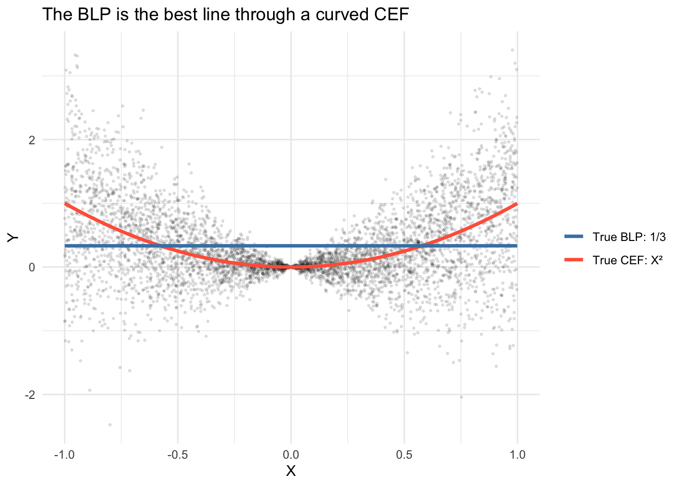 The true BLP is a flat line at \(1/3\) because \(\text{Cov}(X,Y) = \mathbb{E}[X^3] = 0\) by symmetry of \(X\), giving slope \(\beta = 0\) and intercept \(\alpha = \mathbb{E}[Y] = \mathbb{E}[X^2] = 1/3\). The BLP does the best any line can, but it cannot capture the curvature.