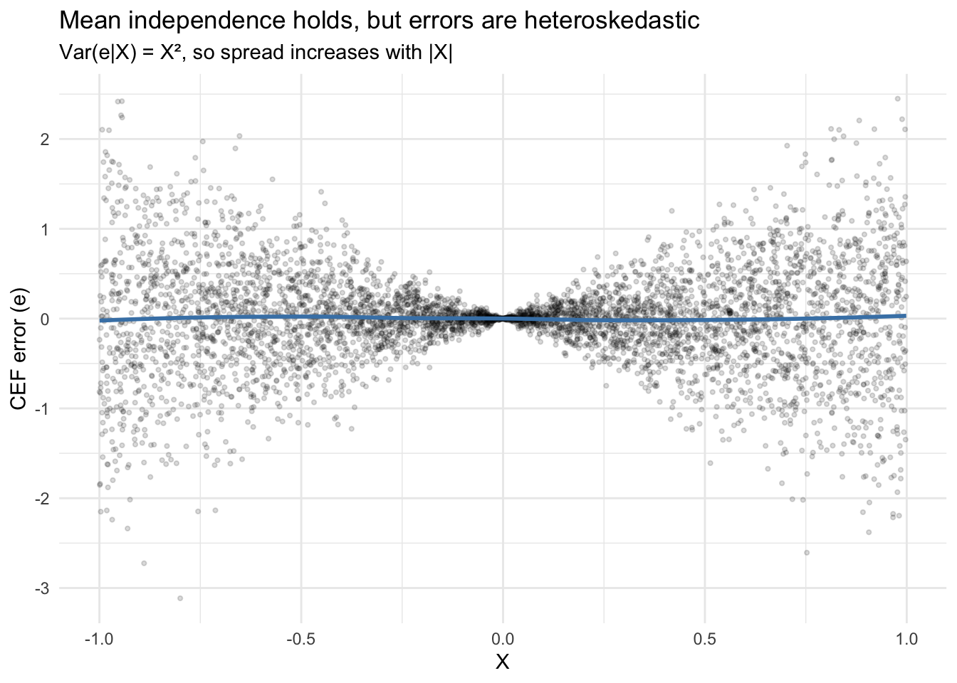 Define the CEF error as \(e = Y - m(X)\). By construction, \(\mathbb{E}[e|X] = 0\) — this is called mean independence. But mean independence is weaker than full independence: the variance of \(e\) can still depend on \(X\).