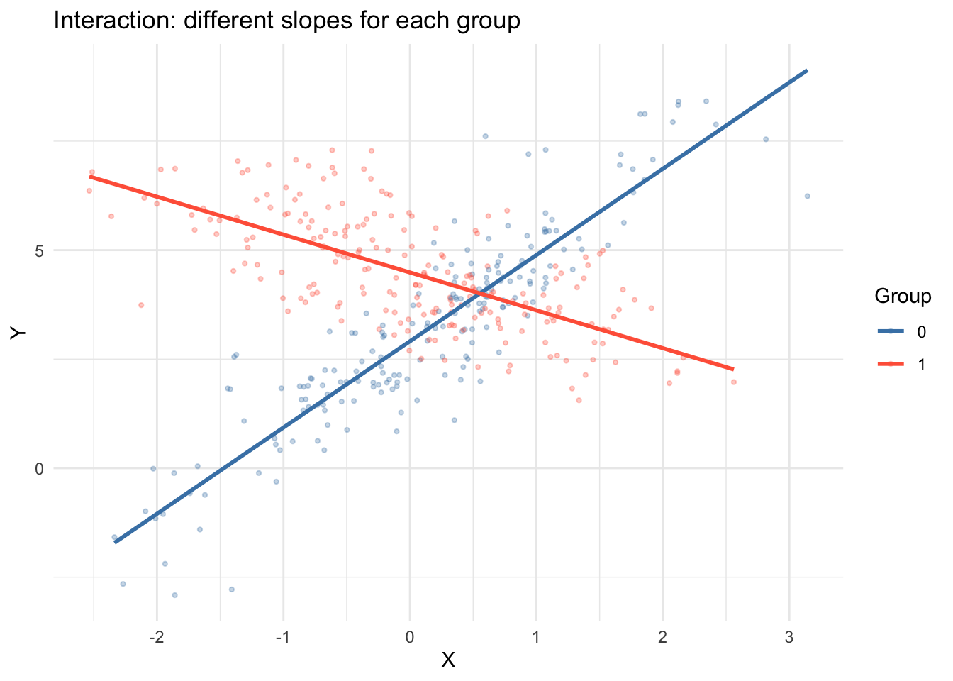 y_int <- 3 + 1.5 * group + 2 * x_int - 3 * group * x_int + rnorm(n_int)