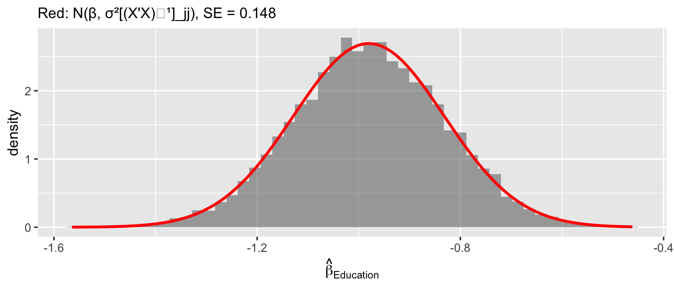 Theorem 1 (MLE Equals OLS) Under the normal linear model \(y|X \sim N(X\beta, \sigma^2 I)\), the MLE of \(\beta\) is identical to the OLS estimator: \(\hat\beta_{MLE} = (X'X)^{-1}X'y\). The MLE of \(\sigma^2\) is \(\hat\sigma^2_{MLE} = \frac{1}{n}\sum\hat{e}_i^2\) (biased downward).
