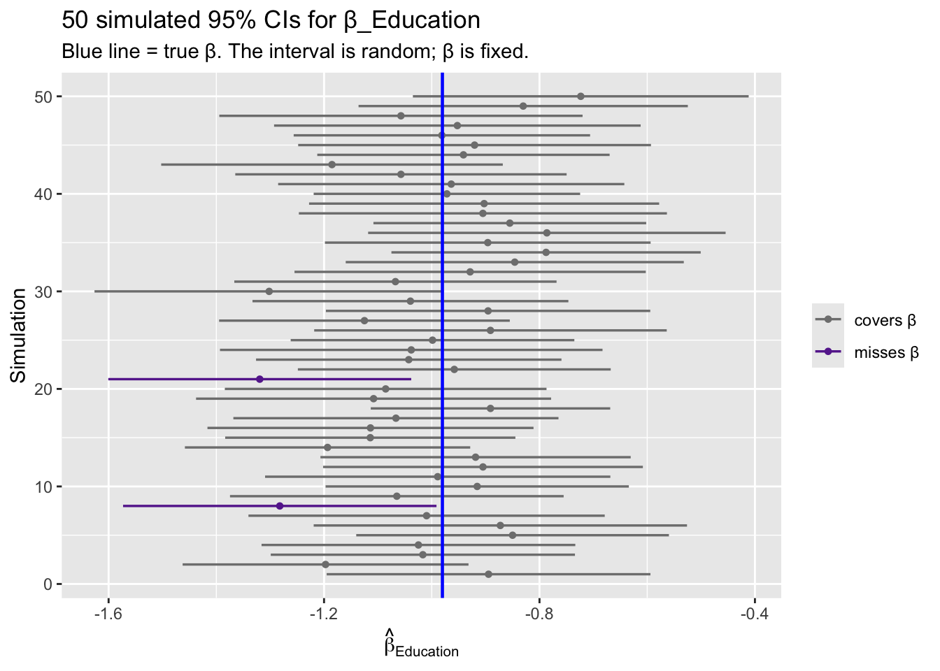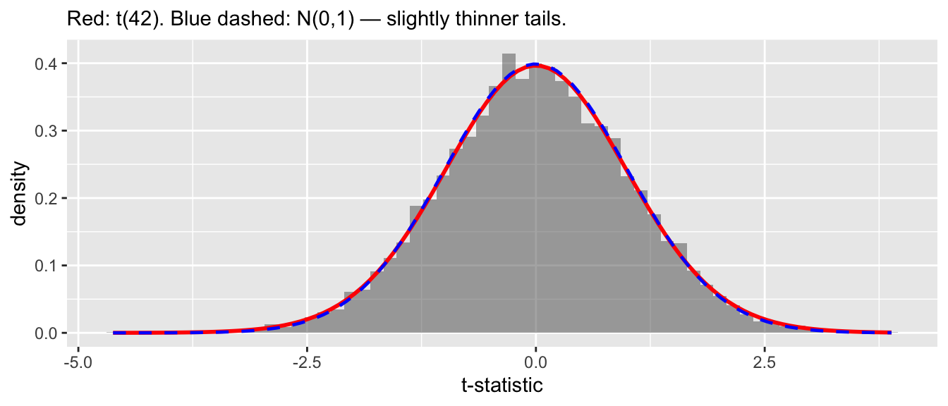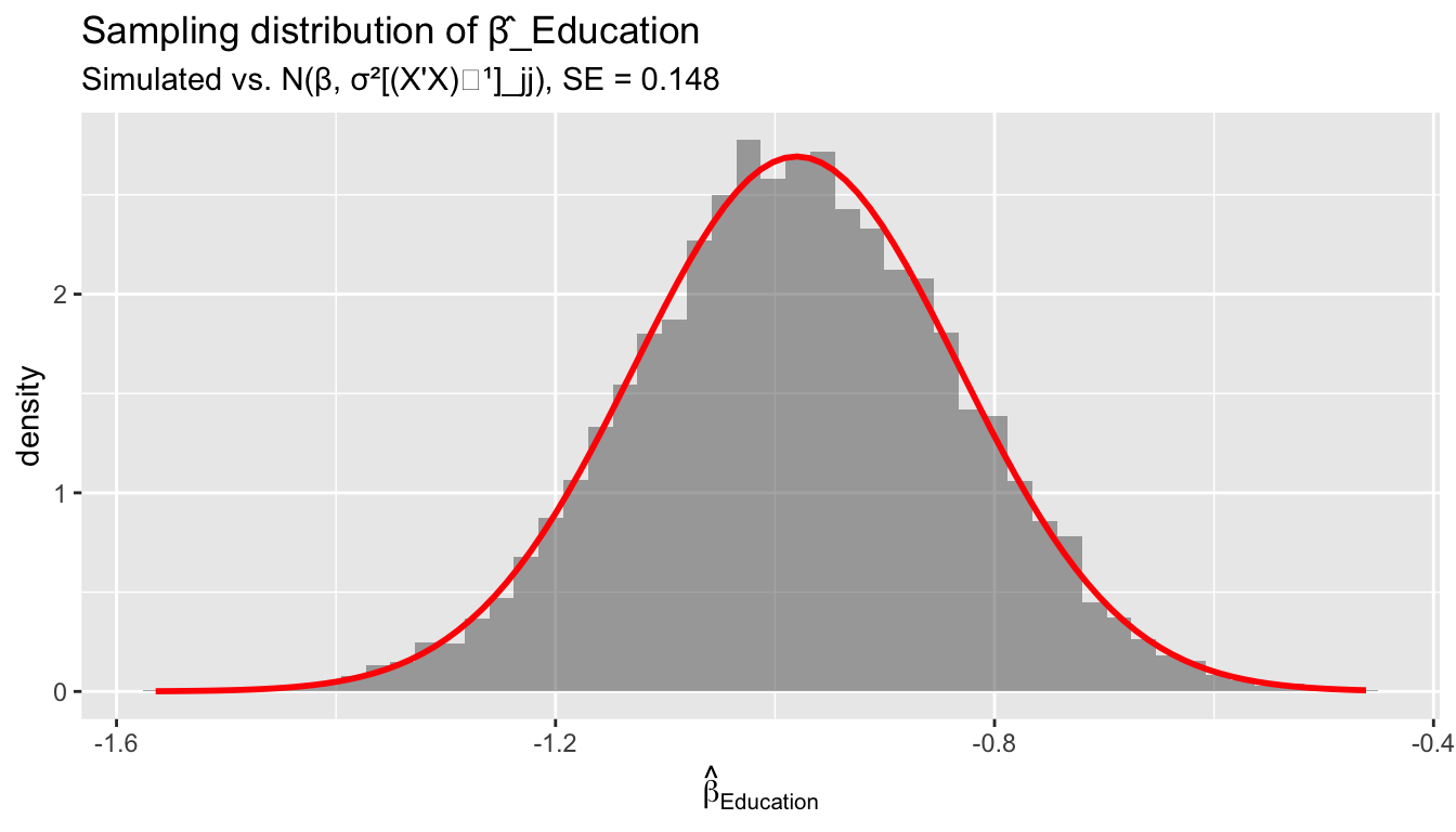 Key takeaway. The normal linear model gives us exact finite-sample distributions: \(\hat{\beta}\) is normal, \(s^2\) is chi-squared, their ratio gives \(t\), and nested model comparisons give \(F\). These are the foundation of every regression table. But they rely on normality and homoskedasticity — when those fail, use robust SEs and asymptotic theory instead.