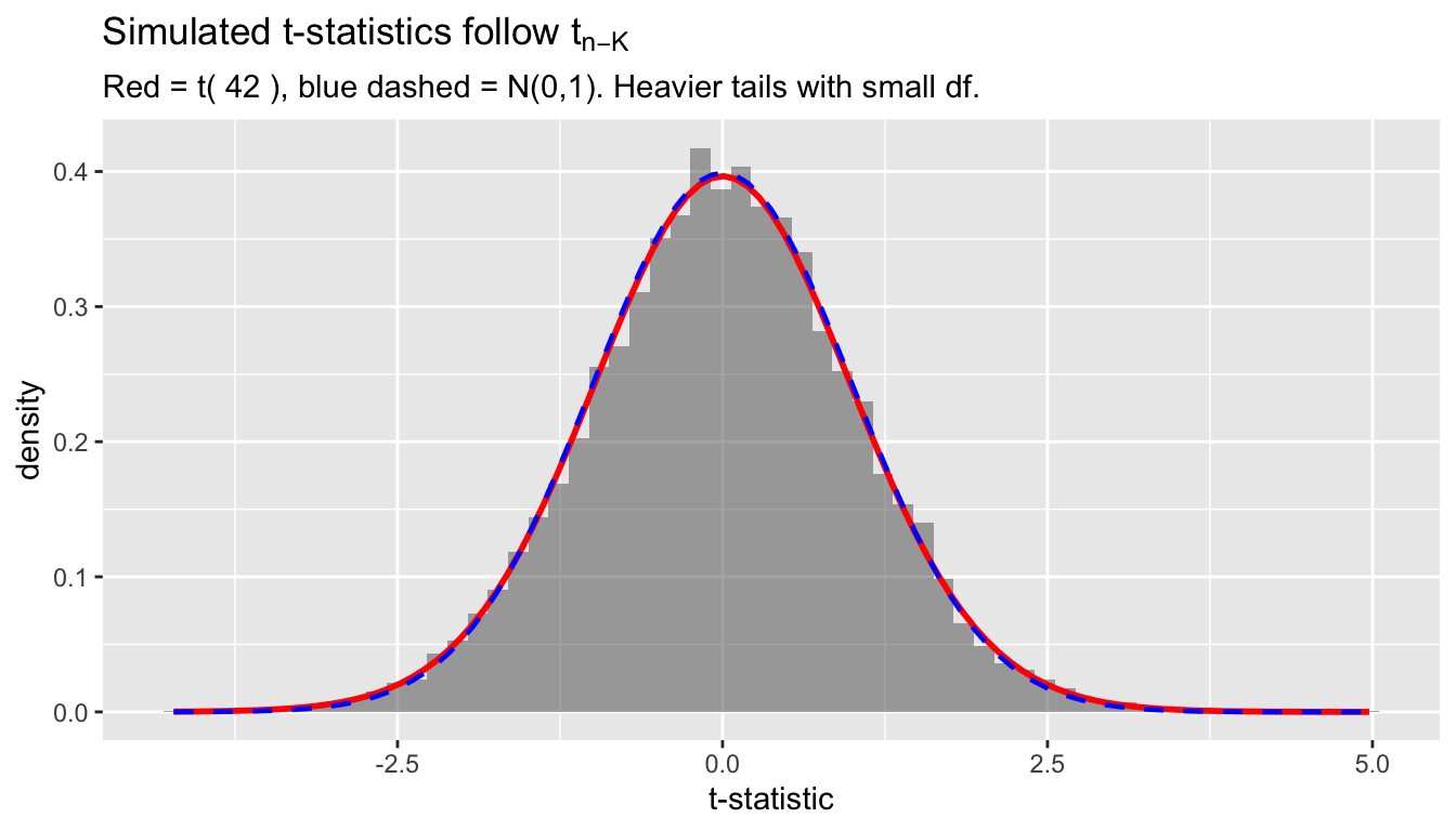 The \(t\)- and \(F\)-distributions are exact only under normality. With heavy-tailed errors (e.g., \(t_5\)), coverage of confidence intervals degrades noticeably. In practice, use robust SEs and asymptotic theory (Chapters 8-9) when normality is suspect. The CLT will justify this asymptotically in Chapter 8.