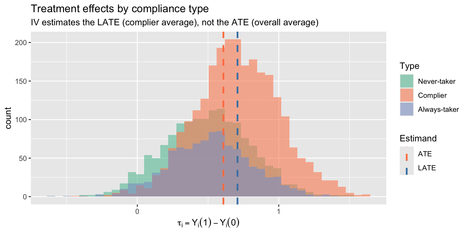 subtitle = "IV estimates the LATE (complier average), not the ATE (overall average)",