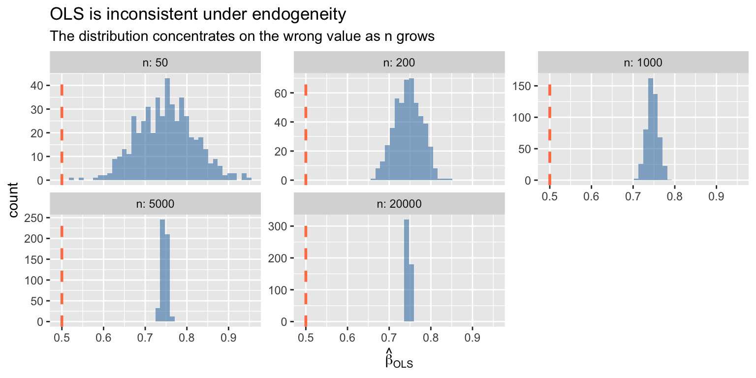 When \(\text{Cov}(X, e) \neq 0\), OLS converges to the wrong value — bias does not shrink with larger samples. This is fundamentally different from finite-sample bias (which vanishes as \(n \to \infty\)). IV trades precision for consistency.