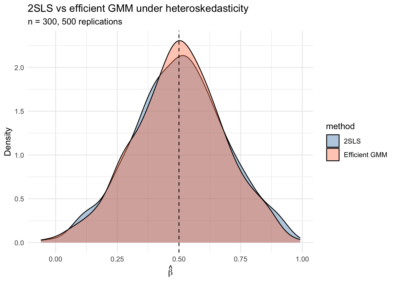 cat("GMM (W = 2SLS): slope =", round(beta_gmm_2sls[2], 4), "\n")GMM (W = 2SLS): slope = 0.5307