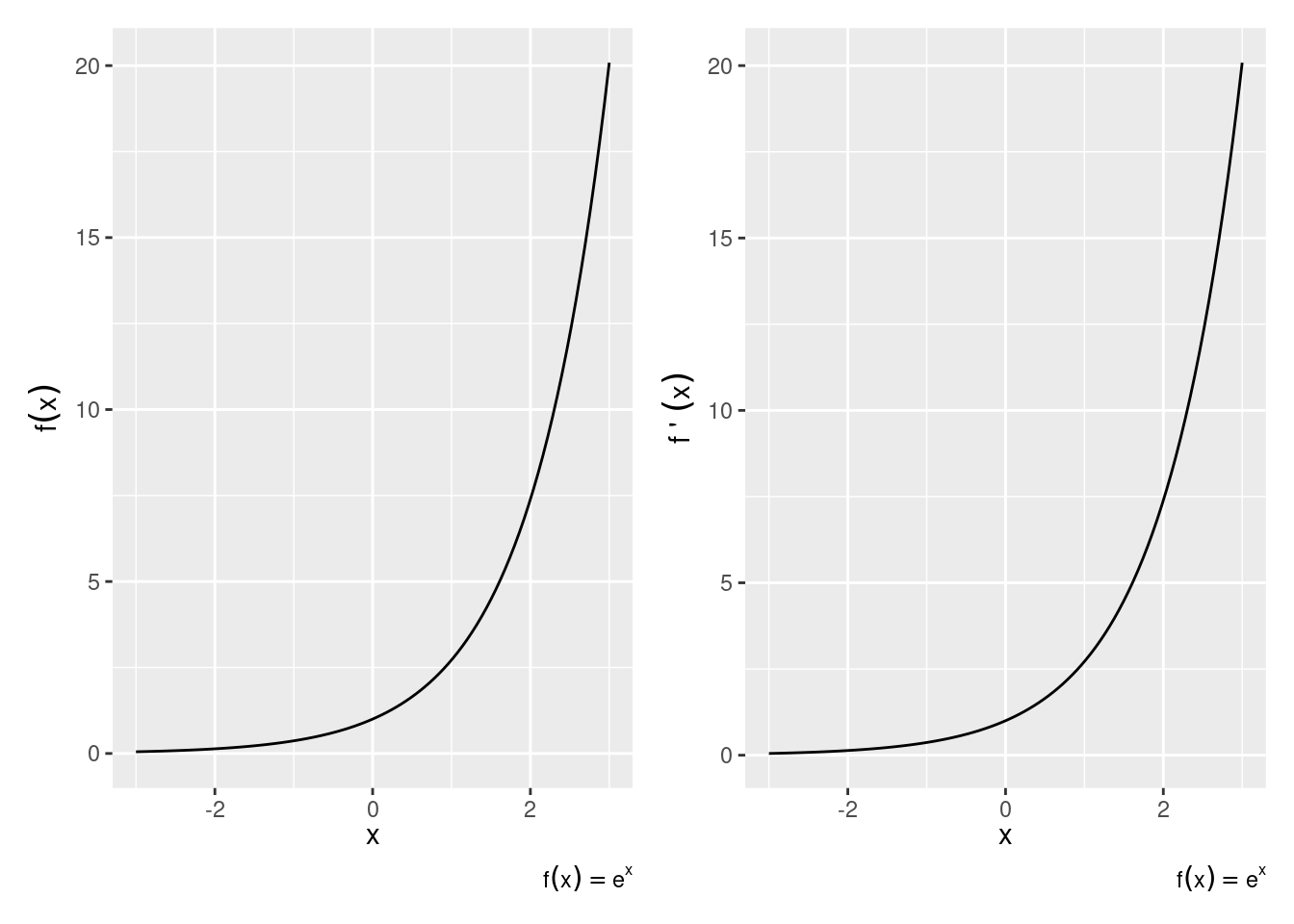Natural logs and exponents (they are inverses of each other; see Section @ref(logexponents)) crop up everywhere in statistics. Their derivative is a special case from the above, but quite elegant.