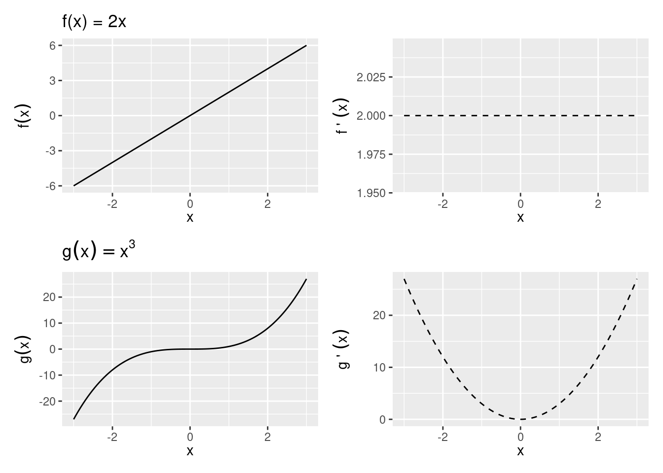 If \(f(x)\) is a straight line, the derivative is the slope. For a curve, the slope changes by the values of \(x\), so the derivative is the slope of the line tangent to the curve at \(x\). See, For example, Figure -Figure 4.1