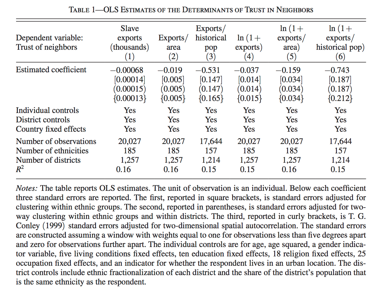 Nunn and Wantchekon (2011) – “The Slave Trade and the Origins of Mistrust in Africa”2 – argues that across African countries, the distrust of co-ethnics fueled by the slave trade has had long-lasting effects on modern day trust in these territories. They argued that the slave trade created distrust in these societies in part because as some African groups were employed by European traders to capture their neighbors and bring them to the slave ships.