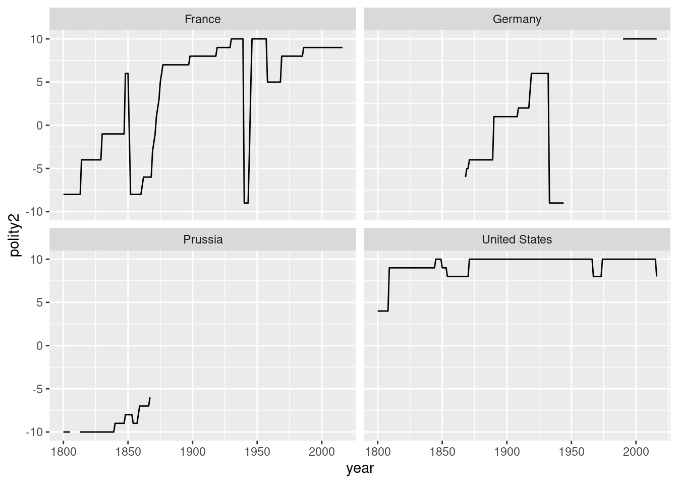 unique(polity$country)[1] "France" "Prussia" "Germany" "United States"