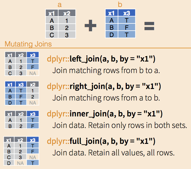 We want to combine these two datasets by merging. Base-R has a function called merge. dplyr has several types of joins (the same thing). Those names are based on SQL syntax.