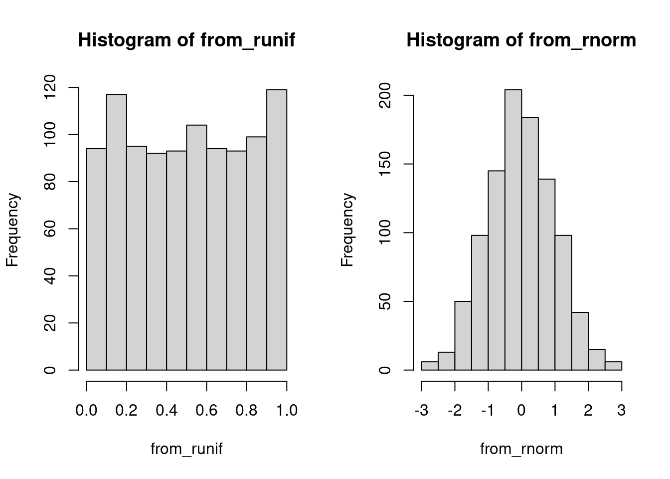set.seed()R doesn’t have the ability to generate truly random numbers! Random numbers are actually very hard to generate. (Think: flipping a coin –> can be perfectly predicted if I know wind speed, the angle the coin is flipped, etc.). Some people use random noise in the atmosphere or random behavior in quantum systems to generate “truly” (?) random numbers. Conversely, R uses deterministic algorithms which take as an input a “seed” and which then perform a series of operations to generate a sequence of random-seeming numbers (that is, numbers whose sequence is sufficiently hard to predict).